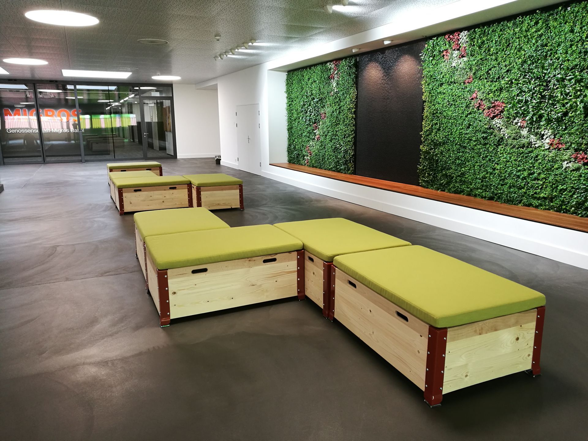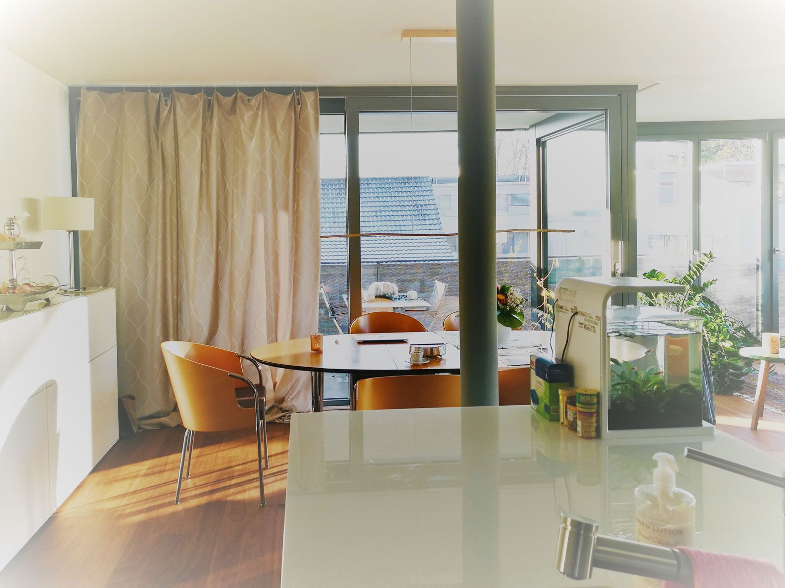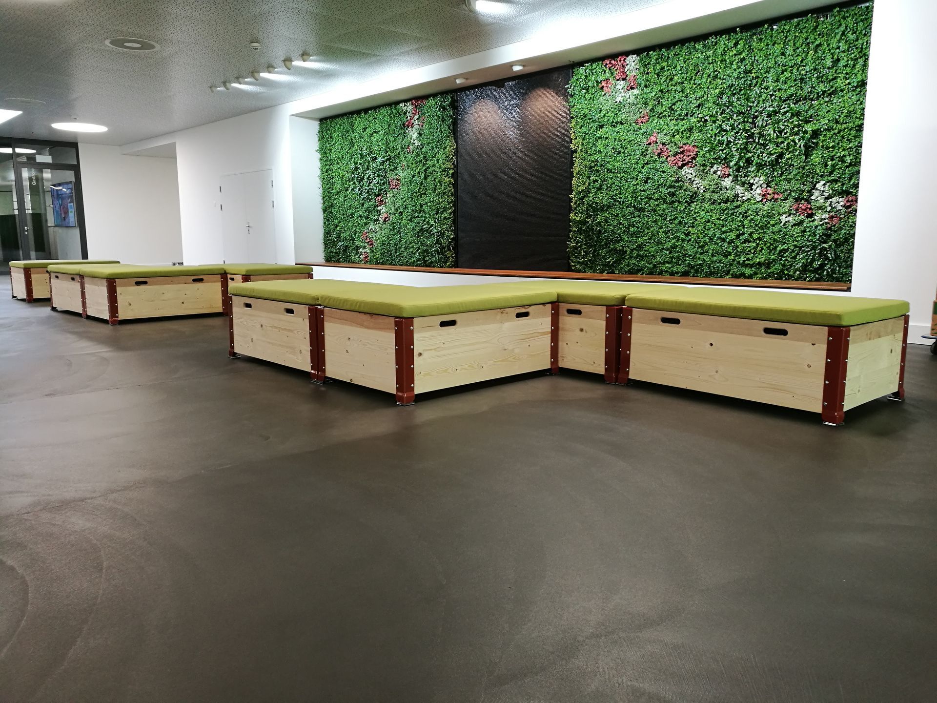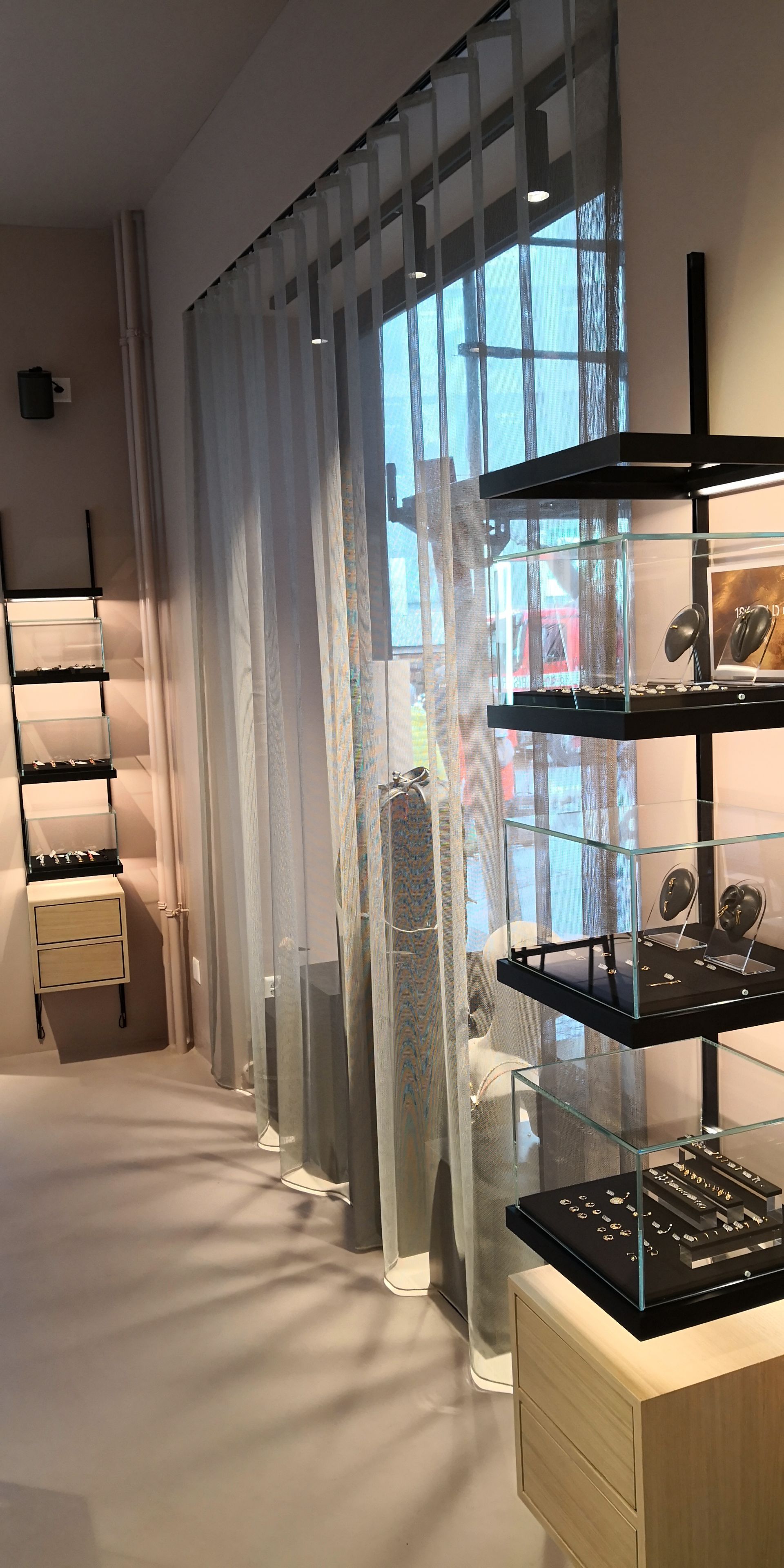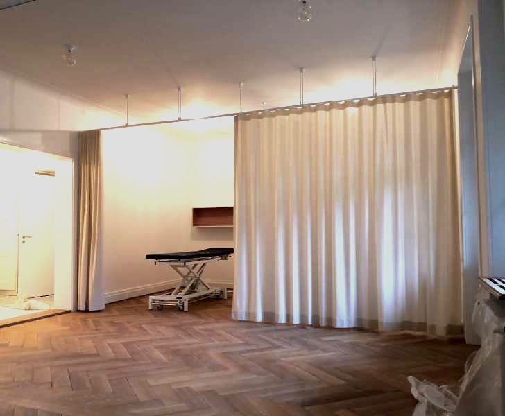 Zwei Vorhänge machen diesen Bereich zu einer eigenen Coachingzone im Raum. So kann der Bereich zum Raum hin, ganz offen sein, nur mit einem feinen Vorhang getrennt werden oder ganz geschlossen funktionieren. Nebst dem funktionalen Aspekt ist diese Installation ach sehr ästhetisch und einzigartig. An der Decke haben wir zwei Kreisförmige Schienenprofile angebracht welche dem Ganzen die nötige Flexibilität bieten.