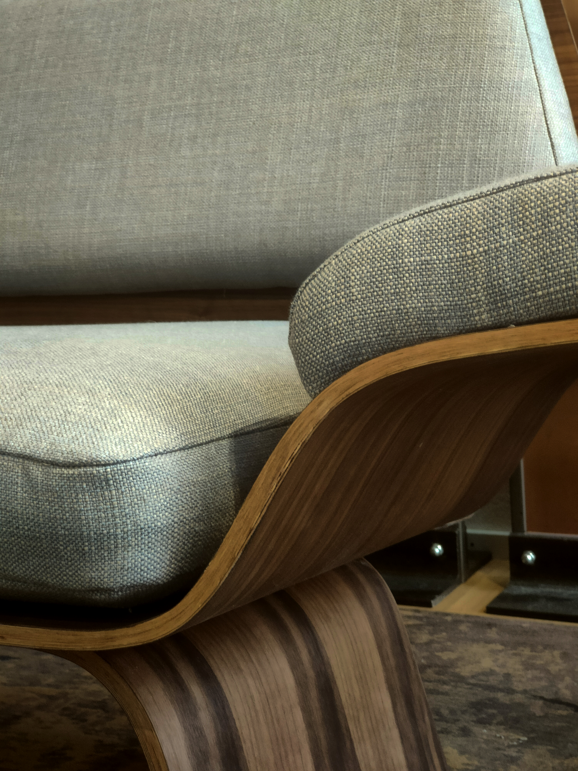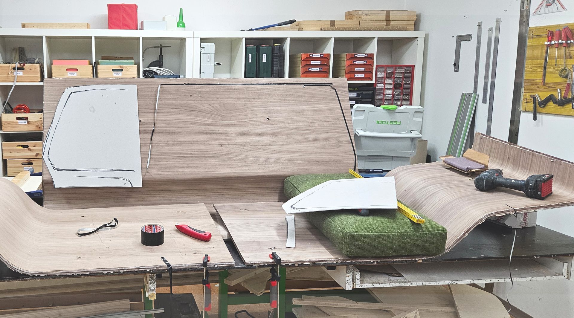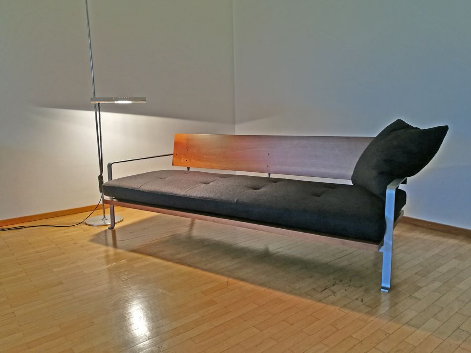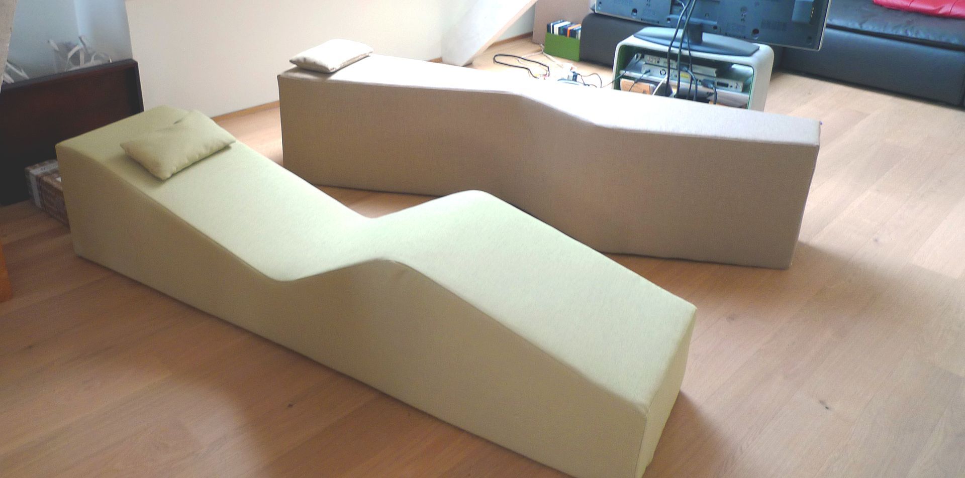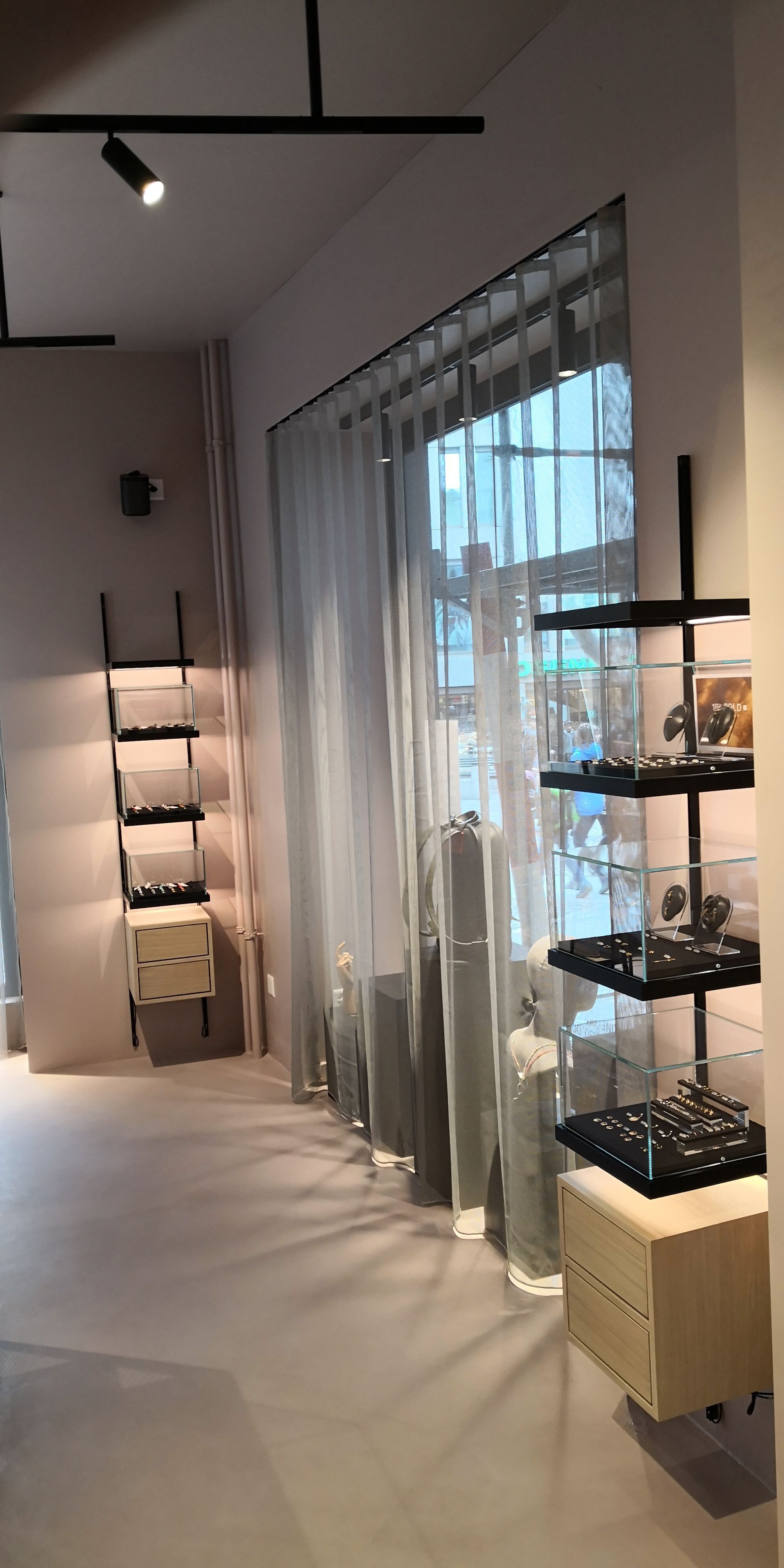 Zwei Vorhänge machen diesen Bereich zu einer eigenen Coachingzone im Raum. So kann der Bereich zum Raum hin, ganz offen sein, nur mit einem feinen Vorhang getrennt werden oder ganz geschlossen funktionieren. Nebst dem funktionalen Aspekt ist diese Installation ach sehr ästhetisch und einzigartig. An der Decke haben wir zwei Kreisförmige Schienenprofile angebracht welche dem Ganzen die nötige Flexibilität bieten.