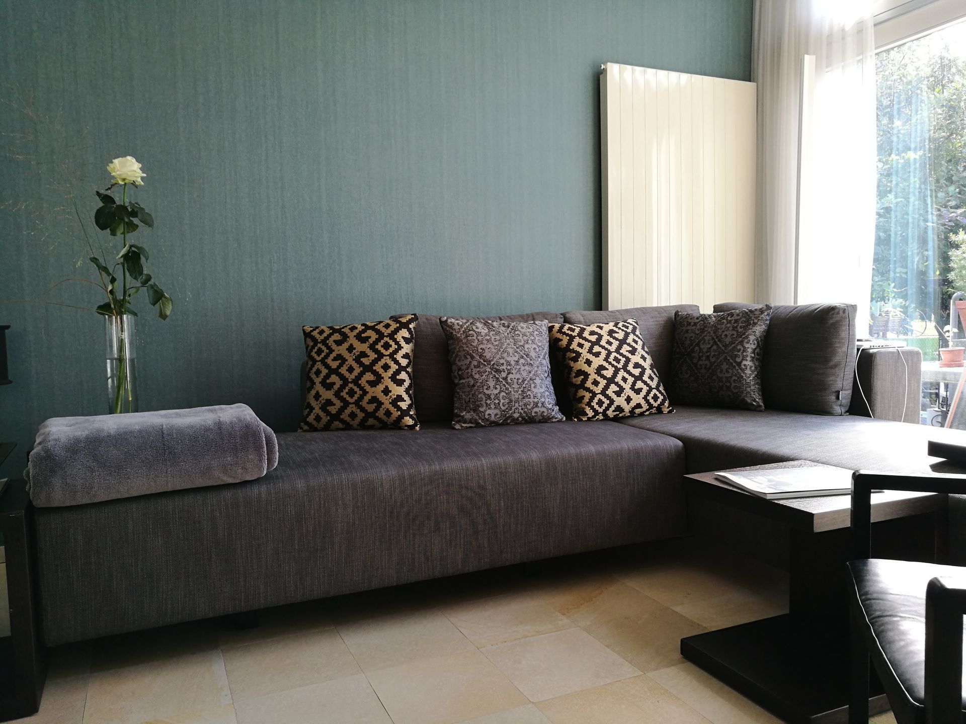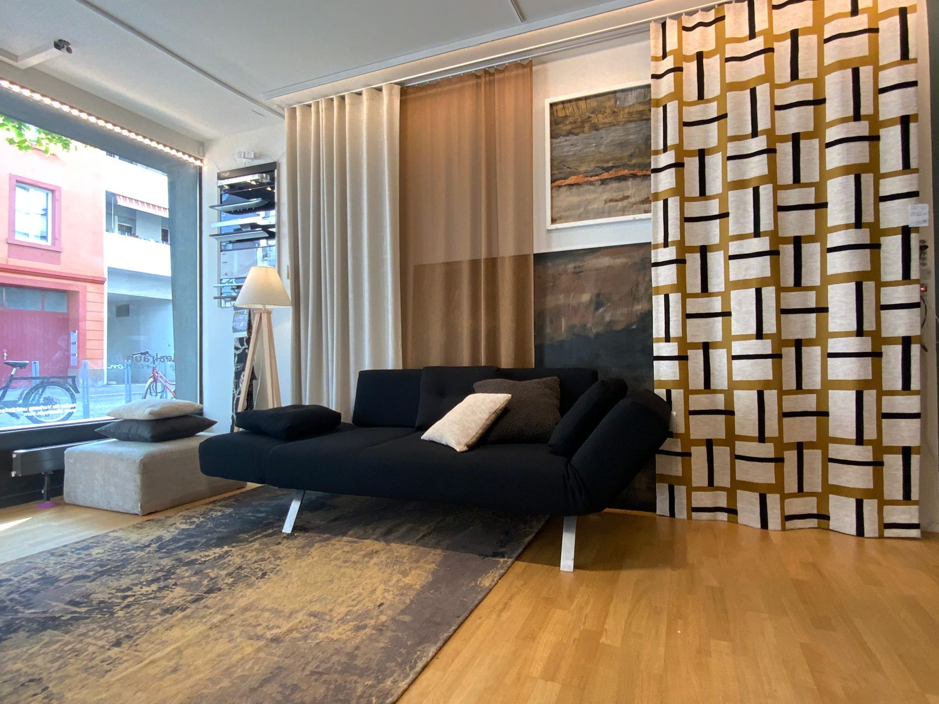 Eine unserer Kundinnen wünschte sich für ihr Wohnzimmer mit Erker einen schlichten Vorhang in einer passenden, nicht zu hellen Farbe. Die Anbringung der Vorhänge direkt im Erker erschien uns und der Kundin nicht praktikabel und ästhetisch. Daher entschieden wir uns, die Vorhänge vor dem spitz zulaufenden Erker zu installieren. Das Ergebnis übertraf die Erwartungen: Der Raum gewann an Ruhe durch die textilen Elemente, während der Erker sich in eine helle Leseecke verwandelte. Der gewählte Stoff, Twinx von Kvadrat, ist ein raffiniertes Doppelgewebe mit einem feinen Moireschimmer und beeindruckenden Lichtspielen, ergänzt durch hervorragende Falleigenschaften. Twinx ist 300 cm hoch gewoben und ideal für solche massgeschneiderten Lösungen. Profitieren Sie von unserem Nähservice, inklusive Ausmessung vor Ort.